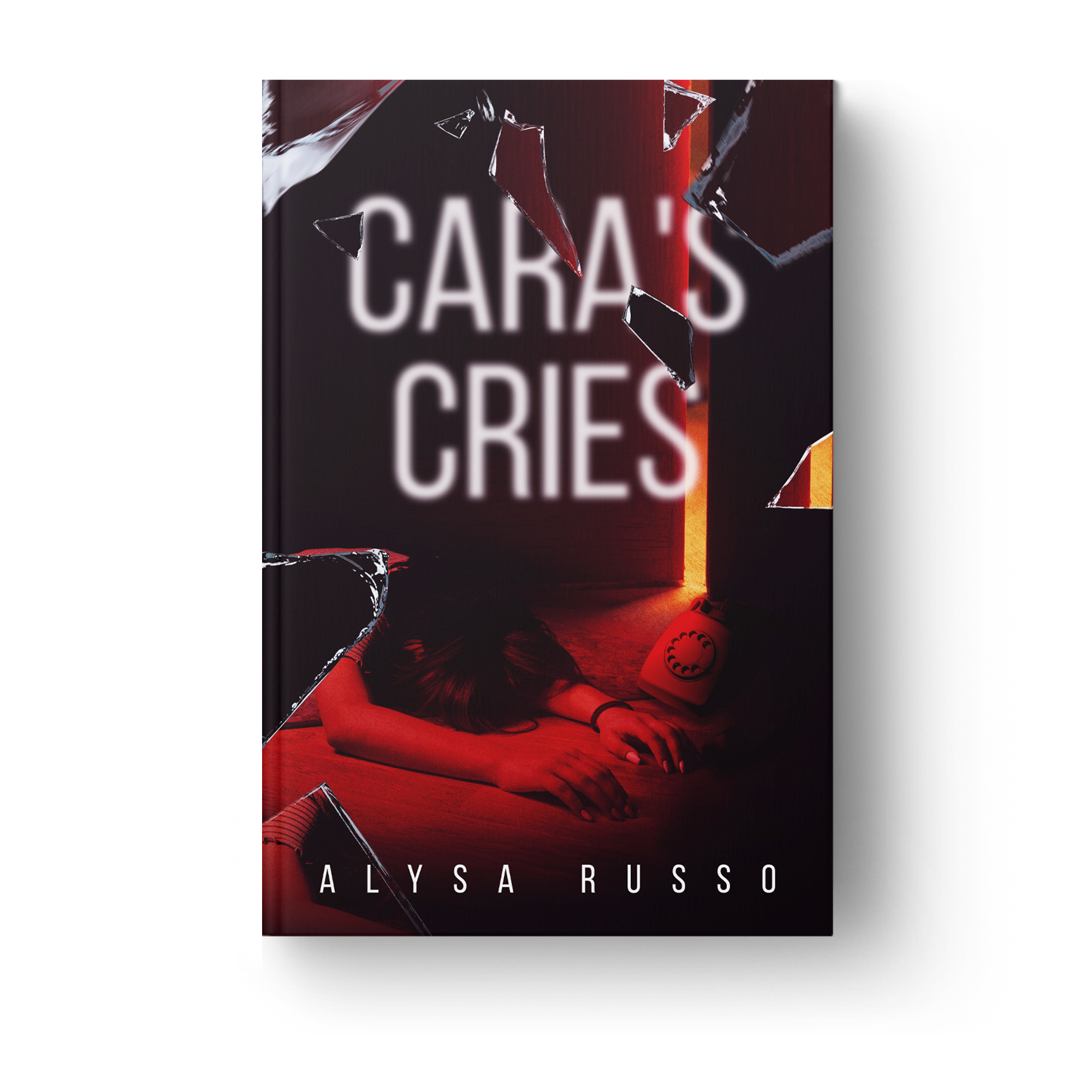 Book cover of "Cara's Cries" by Alysa Russo, featuring a distressed person on the floor with shattered glass and a red hue.